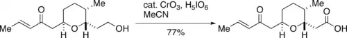 The so-called Jones reagent, prepared from chromium trioxide (CrO3) and aqueous sulfuric acid, oxidizes alcohols to a carboxylic acid. The protocol frequently affords substantial amounts of esters.[12] Problems are the toxicity and environmental unfriendliness of the reagent. Catalytic variant, involving treatment with excess of periodic acid (H5IO6) have been described.[13]