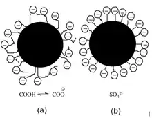 Binders promote the binding of pigment particles between themselves and the coating layer of the paper.[6] Binders are spherical particles less than 1 μm in diameter. Common binders are styrene maleic anhydride copolymer or styrene-acrylate copolymer.[7] The surface chemical composition is differentiated by the adsorption of acrylic acid or an anionic surfactant, both of which are used for stabilization of the dispersion in water.[8] Co-binders, or thickeners, are generally water-soluble polymers that influence the paper's color viscosity, water retention, sizing, and gloss. Some common examples are carboxymethyl cellulose (CMC), cationic and anionic hydroxyethyl cellulose (EHEC), modified starch, and dextrin. Styrene butadiene latex, Styrene acrylic, dextrin, oxidized starch are used in coatings to bind the filler to the paper. Co-binders are natural products such as starch and CMC (Carboxymethyl cellulose), that are used along with the synthetic binders, like styrene acrylic or styrene butadiene. Co-binders are used to reduce the cost of the synthetic binder and improve the water retention and rheology of the coating.