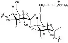 To enhance the paper's strength, cationic starch is added to wet pulp in the manufacturing process. Starch has a similar chemical structure as the cellulose fibre of the pulp, and the surface of both the starch and fibre are negatively charged. By adding cationic (positive charged) starch, the fibre can bind with the starch and thus also increase the interconnections between the fibres. The positively charged portion of the starch is usually formed by quaternary ammonium cations. Quaternary salts that are used include 2.3-epoxy propyl trimethyl ammoniumchloride (EPTAC, also known as or Glytac Quab, GMAC™) and (3-chloro-2-hydroxypropyl) trimethyl ammonium chloride (CHPTAC, also known as Quat 188, Quab 188, Reagens™).