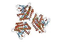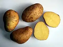 Patatin is a family of glycoproteins found in potatoes (Solanum tuberosum) and is also known as tuberin as it is commonly found within vacuoles of parenchyma tissue in the tuber of the plant. They consist of about 366 amino acids all making up and isoelectric point of 4.9. They have a molecular weight ranging from 40 to 45 kDa, but are commonly found as a 80kDa dimer.[1] The main function of patatin is as a storage protein but it also has lipase activity and can cleave fatty acids from membrane lipids.[2][3] The patatin protein makes up about 40% of the soluble protein in potato tubers.[4] Members of this protein family have also been found in animals.