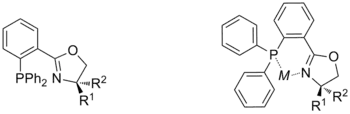 Phosphinooxazolines (often abbreviated PHOX) are a class of chiral ligands used in asymmetric catalysis. Their complexes are particularly effective at generating single enatiomers in reactions involving highly symmetric transition states, such as allylic substitutions, which are typically difficult to perform stereoselectively. The ligands are bidentate and have been shown to be hemilabile[1] with the softer P‑donor being more firmly bound than the harder N‑donor.