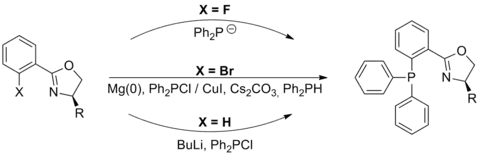 The synthesis of phosphinooxazolines is modular and it is not normally necessary to introduce the phosphine and oxazoline moieties in any particular order. However while examples exist of the phosphine being introduced first,[2] it is more common to see the synthesis of a phenyloxazoline which is subsequently combined with a source of diphenylphosphine. Methods for doing this depend on the nature of the substituent in the X position: