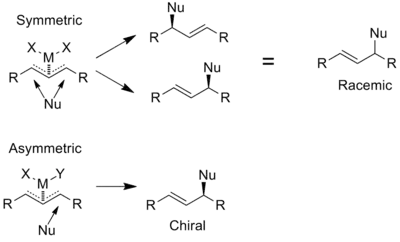 Phosphinooxazolines are used as ligands in allylic substitution reactions as both enantio- and regioselectivity is required to give an enantiomerically pure product due to the transition state being highly symmetric. In the example below all additions are enantioselective however the symmetric complex has no regiocontrol, resulting in a racemic product. The asymmetric complex is both regioselective and enantioselective, resulting in a single enantiomer.