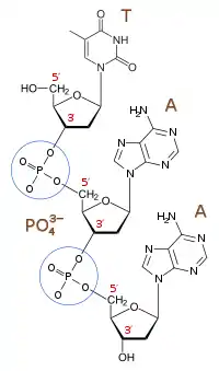 Phosphodiester bonds make up the backbones of DNA and RNA. In the phosphodiester bonds of nucleic acids, a phosphate is attached to the 5' carbon of one nucleoside and to the 3' carbon of the adjacent nucleoside. Specifically, it is the phosphodiester bonds that link the 3' carbon atom of one sugar molecule and the 5' carbon atom of another (hence the name 3', 5' phosphodiester linkage used with reference to this kind of bond in DNA and RNA chains).[3] The involved saccharide groups are deoxyribose in DNA and ribose in RNA. In order for the phosphodiester bond to form, joining the nucleosides, the tri-phosphate or di-phosphate forms of the nucleotide building blocks are broken apart to give off energy required to drive the enzyme-catalyzed reaction.[4] In DNA replication, for example, formation of the phosphodiester bonds is catalyzed by a DNA polymerase enzyme, using a pair of magnesium cations and other supporting structures.[3] Formation of the bond occurs not only in DNA and RNA replication, but also in the repair and recombination of nucleic acids, and may require the involvement of various polymerases, primers, and/or ligases. During the replication of DNA, for example, the DNA polymerase I leaves behind a hole between the phosphates in the newly formed backbone. DNA ligase is able to form a phosphodiester bond between the nucleotides on each side of the gap.[2]