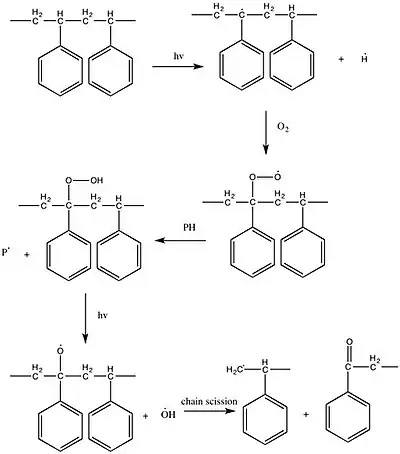 For polystyrene the complete mechanism of photo-oxidation is still a matter of debate, as different pathways may operate concurrently[20] and vary according to the wavelength of the incident light.[21][22] Regardless, there is agreement on the major steps.[19]