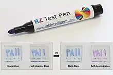 Photocatalyst activity indicator ink (paii) is a substance used to identify the presence of an underlying heterogeneous photocatalyst and to measure its activity. Such inks render visible the activity of photocatalytic coatings applied to various "self-cleaning" products. The inks contain a dyestuff that reacts to ultraviolet radiation in the presence of the photocatalytic agent in the coating. They are applied to the coated product (usually by a pen, brush, or drawdown bar) and show a color change or disappearance when exposed to ultraviolet radiation. The use of a paii based on the dye resazurin forms the basis of an ISO standard test for photocatalytic activity.[1]