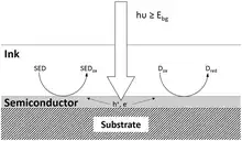Photocatalyst activity indicator inks are a recent advance in the visual demonstration of photocatalysis and the assessment of the activity of photocatalyst materials.[15][25] They are inexpensive, easy to use and provide a very quick route to demonstrating the presence of a photocatalytic film, even under low levels of UV light. Unlike the photo-oxidative bleaching of methylene blue,[22] they use the underlying semiconductor photocatalyst film to photoreduce the dye (Dox in figure 2), in the ink coating, to another (usually colourless) form, (Dred in figure 2) whilst simultaneously oxidising an easily oxidised organic species, a sacrificial electron donor (SED), such as glycerol, which is also present in the ink.[15][25][26] The kinetics of reduction of the dye in a paii have been studied in great detail.[27][28] Figure 2 illustrates the basic principles of operation of a paii when applied to a product that has a thin photocatalyst film coating.