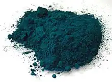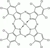 Phthalocyanine green G, which has many commercial names, is a synthetic green pigment from the group of phthalocyanine dyes, a complex of copper(II) with chlorinated phthalocyanine. It is a soft green powder, which is insoluble in water.[1] It is a bright, high intensity colour used in oil and acrylic based artist's paints, and in other applications.