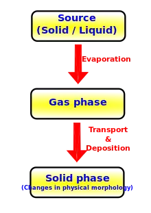 Physical vapor deposition (PVD), sometimes called physical vapor transport (PVT), describes a variety of vacuum deposition methods which can be used to produce thin films and coatings on substrates including metals, ceramics, glass, and polymers. PVD is characterized by a process in which the material transitions from a condensed phase to a vapor phase and then back to a thin film condensed phase. The most common PVD processes are sputtering and evaporation. PVD is used in the manufacturing of items which require thin films for optical, mechanical, electrical, acoustic or chemical functions. Examples include semiconductor devices such as thin-film solar cells,[1] microelectromechanical devices such as thin film bulk acoustic resonator, aluminized PET film for food packaging and balloons,[2] and titanium nitride coated cutting tools for metalworking. Besides PVD tools for fabrication, special smaller tools used mainly for scientific purposes have been developed.[3]