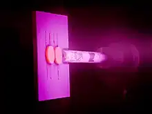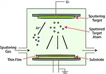 • Sputter deposition: a glow plasma discharge (usually localized around the "target" by a magnet) bombards the material sputtering some away as a vapor for subsequent deposition.