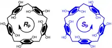 The orientation of the hydroquinone oxygens on both rims of the pillararene allow the macrocycle to exhibit planar chirality. When the substituent on the hydroquinone oxygen is small enough to fit through the cavity of the pillararene, allowing for oxygen-through-the-annulus rotation to occur, racemization occurs. If this substituent is large enough to prevent rotation, optically active pillararene macrocycles can be isolated.[7][8]
