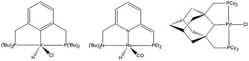 In chemistry, a transition metal pincer complex is a type of coordination complex with a pincer ligand. Pincer ligands are chelating agents that binds tightly to three adjacent coplanar sites in a meridional configuration.[1][2] The inflexibility of the pincer-metal interaction confers high thermal stability to the resulting complexes. This stability is in part ascribed to the constrained geometry of the pincer, which inhibits cyclometallation of the organic substituents on the donor sites at each end. In the absence of this effect, cyclometallation is often a significant deactivation process for complexes, in particular limiting their ability to effect C-H bond activation. The organic substituents also define a hydrophobic pocket around the reactive coordination site. Stoichiometric and catalytic applications of pincer complexes have been studied at an accelerating pace since the mid-1970s. Most pincer ligands contain phosphines.[3] Reactions of metal-pincer complexes are localized at three sites perpendicular to the plane of the pincer ligand, although in some cases one arm is hemi-labile and an additional coordination site is generated transiently. Early examples of pincer ligands (not called such originally) were anionic with a carbanion as the central donor site and flanking phosphine donors; these compounds are referred to as PCP pincers.