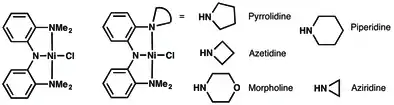 Although the most common class of pincer ligands features PCP donor sets, variations have been developed where the phosphines are replaced by thioethers and tertiary amines. Many pincer ligands also feature nitrogenous donors at the central coordinating group position (see figure), such as pyridines.[4]