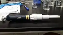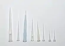 ![]() Clockwise from top left: various sizes of micropipettes; a graduated serological pipette attached to an electronic manual pipetter; two Pasteur pipettes. | |