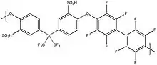 PBI has been used as the membranes for various separation purposes. Traditionally, PBI was used semi-permeable membranes for electrodialysis, reverse osmosis or ultrafiltration.[18] PBI has also used for gas separations.[19][20] due to its close chain packing since PBI has rigidity structure and strong hydrogen bonding. PBI membranes are dense, with very low gas permeability. To be proton conductive, PBI usually is doped with acid. The higher level of the acid doping, the more conductive PBI is. But one problem raised is the mechanical strength of PBI decreases at the same time. The optimum doping level is thus a compromise between these two effects. Thus, multiple methods such as ionic cross-linking, covalent cross-linking and composite membranes[18] have been researched to optimize the doping level at which PBI has an improved conductivity without sacrificing mechanical strength. Sulfonated partially fluorinated arylene main chain polymer exhibit good thermal and extended stability, high proton conductivities, less acid swelling, reasonable mechanical strength.[21]