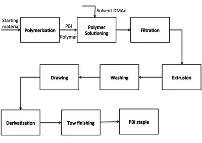 The most common form of PBI used in industry is the fiber form. The fiber process following polymerization is shown in the figure. The polymer is made into solution using dimethylacetamide as solvent. The solution is filtered and converted into fiber using a high temperature dry-spinning process. The fiber is subsequently drawn at elevated temperature to get desired mechanical properties. It is then sulfonated and made into staple using conventional crimping and cutting techniques.