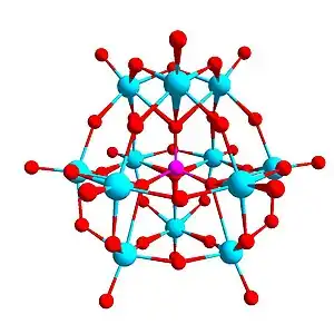 Ammonium phosphomolybdate, [PMo12O40]3− anion, was reported in 1826.[5] The isostructural phosphotungstate anion was characterized by X-ray crystallography 1934. This structure is called the Keggin structure after its discoverer.[6]
