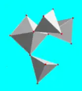 Polyoxotechnetates form only in strongly acidic conditions, such as in HTcO4 or trifluoromethanesulfonic acid solutions. The first empirically isolated polyoxotechnetate was the red [Tc20O68]4−. It contains both Tc(V) and Tc(VII) in ratio 4: 16 and is obtained as the hydronium salt [H7O3]4[Tc20O68]·4H2O by concentrating an HTcO4 solution.[12] Corresponding ammonium polyoxotechnetate salt was recently isolated from trifluoromethanesulfonic acid and it has very similar structure.[13] The only polyoxorhenate formed in acidic conditions in presence of pyrazolium cation. The first empirically isolated polyoxorhenate was the white [Re4O15]2−. It contains Re(VII) in both octahedral and tetrahedral coordination.[14]