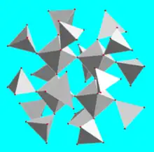 When such acidifications are conducted in the presence of phosphate or silicate, heteropolymetalate result. For example, the phosphotungstate anion [PW12O40]3− consists of a framework of twelve octahedral tungsten oxyanions surrounding a central phosphate group.