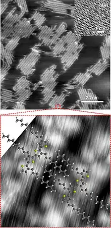 Poly(3-(perfluorooctyl)thiophene)s is soluble in supercritical carbon dioxide[42][43] Oligothiophenes capped at both ends with thermally-labile alkyl esters were cast as films from solution, and then heated to remove the solublizing end groups. Atomic force microscopy (AFM) images showed a significant increase in long-range order after heating.[44]