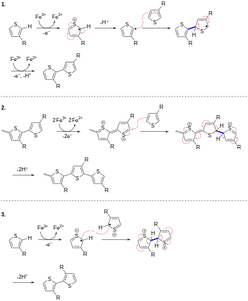 In terms of mechanism, the oxidative polymerization using ferric chloride, a radical pathway has been proposed. Niemi et al. reported that polymerization was only observed in solvents where the catalyst was either partially or completely insoluble (chloroform, toluene, carbon tetrachloride, pentane, and hexane, and not diethyl ether, xylene, acetone, or formic acid), and speculated that the polymerization may occur at the surface of solid ferric chloride.[62] However, this is challenged by the fact that the reaction also proceeds in acetonitrile, which FeCl3 is soluble in.[63] Quantum mechanical calculations also point to a radical mechanism. The mechanism can also be inferred from the regiochemistry of the dimerization of 3-methylthiophene since C2 in [3-methylthiophene]+ has the highest spin density.
