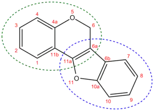Pterocarpan chemical structure. It consists of a 1-benzofuran moiety (dotted blue circle) fused to a 2H-chromene moiety (dotted green circle). The systematic name for it is 6H-[1]benzofuro[3,2-c]chromene. The new numbering of the resulting moiety is shown with red numbers.