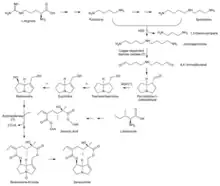 The polyamines putrescine and spermidine are derived from the basic amino acid arginine. Subsequently, homospermidine synthase exchanges the 1,3-diamonopropane by putrescine and forms symmetric homospermidine. Oxidation of homospermidine by copper-dependent diamine oxidases initiates cyclization to pyrrolizidine-1-carbaldehyde, which is reduced, to 1-hydroxymethylpyrrolizidine. Desaturation and hydroxylation ultimately form retronecine, which is acylated with an activated necic acid, for instance with senecyl-CoA2 as in the example shown below.[15]