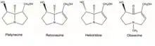 PAs are compounds made up of a necine base, a double five-membered ring with a nitrogen atom in the middle, and one or two carboxylic esters called necic acids.[17] Four major necine bases are described, with Retronecine and its enantiomer Heliotridine being the largest group, and highly toxic. Another group is the platynecine, the difference between these groups is its saturated base, which makes it less toxic.[18] Most bases have a 1,2-unsaturated base. Another difference in the groups is with Otonecine, which cannot form N-oxides, due to the methylation of the nitrogen atom.[16]