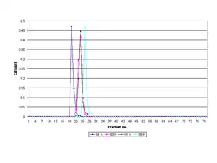 Before an electrophoretic run is started the prepared 4% T (total polymer content (T)), 2.67% C (cross-linker concentration (C)) gel is pre-run to equilibrate it.[6] It is essentially non-sieving and optimal for electrophoresis of proteins greater than or equal to 200 ku. Proteins migrate in it more or less on the basis of their free mobility.[26] For these reasons interactions of the gel with the biomolecules are negligibly low, and thus, the proteins separate cleanly and predictably at a polymerization time of 69 hr (cf. fig. Electropherogram). The separated metalloproteins including biomolecules ranging from approximately < 1 ku to greater than 30 ku (e.g., metal chaperones, prions, metal transport proteins, amyloids, metalloenzymes, metallopeptides, metallothionein, phytochelatins) are not dissociated into apoproteins and metal cofactors.[27]