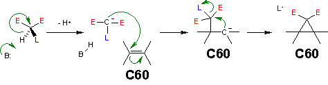 The reaction mechanism for this reaction is as follows: a base abstracts the acidic malonate proton generating a carbanion or enolate which reacts with the electron deficient fullerene double bond in a nucleophilic addition. This in turn generates a carbanion which displaces bromine in a nucleophilic aliphatic substitution in an intramolecular ring cyclopropane ring closure.