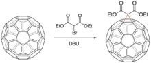 The Bingel reaction in fullerene chemistry is a fullerene cyclopropanation reaction to a methanofullerene first discovered by C. Bingel in 1993 with the bromo derivative of diethyl malonate in the presence of a base such as sodium hydride or DBU.[1] The preferred double bonds for this reaction on the fullerene surface are the shorter bonds at the junctions of two hexagons (6-6 bonds) and the driving force is relief of steric strain.