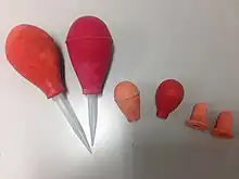 Rubber bulbs are used in chemistry laboratories, by placing them on top of a glass or plastic tube. It serves as a vacuum source for filling reagents through a pipette or pasteur pipette and also help control the flow of liquid from the dropping bottle.[1] By using rubber bulb, the contact of the mouth to the chemicals can be avoided. These rubber rods come in different shapes, sizes and colors.[2]