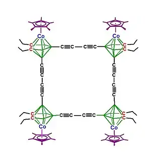Monomeric double-decker and multidecker sandwiches have been used as building blocks for extended systems, some of which exhibit electron delocalization between metal centers. An example of a cyclic poly(metallacarborane) complex is the octahedral "carbon-wired" system shown below, which contains a planar C16B8 macrocycle.[20]