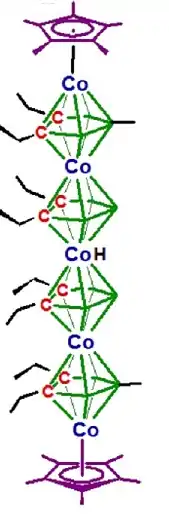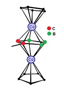 In 1973 the electrically neutral air-stable triple-decker cobaltacarborane sandwiches 1,7,2,3- and 1,7,2,4-CpCo(RHC2B3H3)Cp (where R = H, Me) were isolated and characterized by multinuclear NMR and X-ray studies[13] (the structure of the 1,7,2,3 isomer is shown).