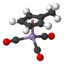Metallocenes including just one facially-bound planar organic ligand instead of two gives rise to a still larger family of half-sandwich compounds. The most famous example is probably methylcyclopentadienyl manganese tricarbonyl. Such species are occasionally referred to as piano-stool compounds, at least when there are three diatomic ligands in addition to the hydrocarbon "seat" of the piano stool. The name derives from the similarity of the structure to such a "stool" with the seat being a facial planar organic compound, such as benzene or cyclopentadiene, and the legs being ligands such as CO or allyl.[9][10]