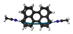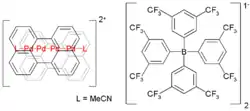 Another family of sandwich compound involves more than one metal sandwiched between two carbocyclic rings. Examples of the double sandwich include V2(indenyl)2,[22] Ni2(COT)2[23] and Cr2(pentalene)2. Depicted at right is an example of a multimetallic sandwich compound, which has four palladium atoms joined in a chain sandwiched between two perylene units.[24] The counterions are bulky tetraarylborates.