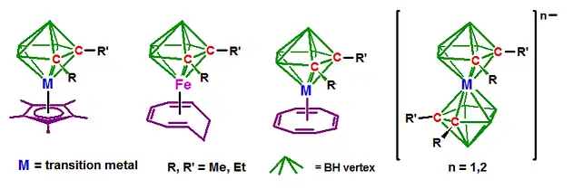 - Metal–carborane complexes (metallacarboranes), a very large and diverse family in which main-group or transition metal ions are coordinated to carborane ligands to form polyhedral cages ranging in size from 6 to 15 vertices. Examples include bis(dicarbollide) complexes,[4] such as [M(C2B9H11)2]z− and [Fe(C2B9H11)2]2−, and small-carborane sandwiches such as (R2C2B3H5)M(C2B4H6) and (R5C5)M(R′2)C2B4H4) where M is a transition metal and R and R′ are methyl or ethyl.[5][6]