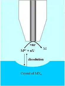 Electric potential is manipulated through the UME tip in a bulk solution containing a redox-active couple (e.g. Fe2+/Fe3+). When a sufficiently negative potential is applied, (Fe3+) is reduced to (Fe2+) at the UME tip, generating a diffusion-limited current.[13] The steady-state current is governed by the flux of oxidized species in solution to the UME disc and is given by: