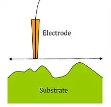 The most common scanning mode is constant-height mode,[7] where the tip height is unchanging and is scanned across the surface in the x-y plane. Alternatively, constant distance measurements are possible, which change the z position to maintain the probe to sample distance as the probe is scanned across the surface in the x-y plane. The constant distance measurement can be based on an electrical signal as is the case in the constant-current mode,[7] where the device attempts to maintain a constant current by changing the substrate to tip distance, d, and recording the change in d. A mechanical signal can also be used to control the probe to sample distance. Examples of this are the intermittent contact (ic)-SECM[21] and shear force[22] techniques which use changes in probe vibration to maintain the probe to sample distance.