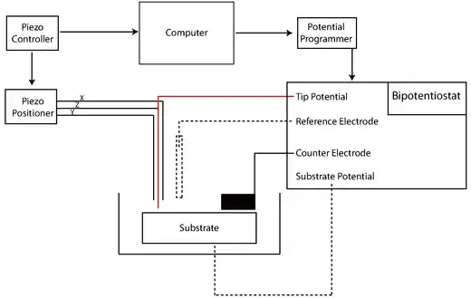 The potentiostat biases and measures the voltage using the standard three electrode system of voltammetry experiments. The UME acts as the working electrode to apply a controlled potential to the substrate. The auxiliary electrode (or counter electrode) acts to balance the current generated at the working electrode, often through a redox reaction with the solvent or supporting electrolyte. Voltage measured with regard to the well defined reduction potential of the reference electrode, although this electrode itself does not pass any current.