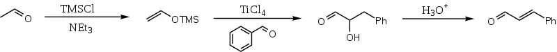 Using LDA will not work when attempting to make enolate ion from aldehydes. They are so reactive that self-condensation will occur. One way to get around this is to turn the aldehyde into a silyl enol ether using trimethylsilyl chloride and a base, such as triethylamine, and then perform the aldol condensation. Here this tactic is employed in the condensation of acetaldehyde and benzaldehyde. A Lewis acid, such as TiCl4, must be used in order to promote condensation.[4]
