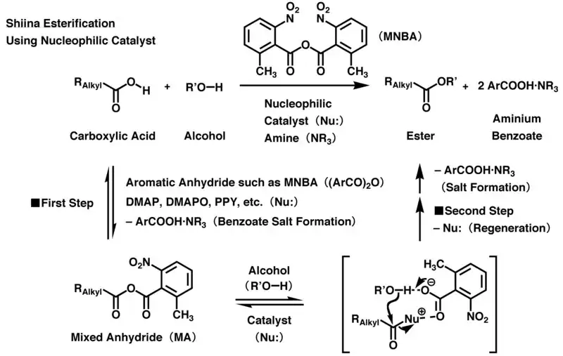 In the basic reaction, 2-methyl-6-nitrobenzoic anhydride (MNBA) is primarily used as a dehydration condensation agent.[5] First, the nucleophilic catalyst acts on the MNBA to produce activated acyl carboxylate. The reaction of carboxyl group in the carboxylic acid with the activated acyl carboxylate produces the corresponding MA, in the same manner as in the acidic reaction. Then, the nucleophilic catalyst acts selectively on a carbonyl group derived from the carboxylic acid in MA to again produce activated acyl carboxylate. The hydroxyl group in the alcohol attacks its host molecule through intermolecular nucleophilic substitution, and at the same time, carboxylate anion, derived from 2-methyl-6-nitrobenzoic acid, acts as a deprotonation agent, promoting the progression of the esterification and producing the desired carboxylic ester. To balance the reaction, each MNBA accepts the atoms of one water molecule from its starting materials, changing itself into two molecules of the amine salt of 2-methyl-6-nitrobenzoic acid, and thus, terminating the reaction. Because the nucleophilic catalyst is reproduced at the end of the reaction, only small stoichiometric quantities are required.