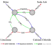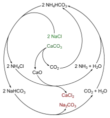 The actual implementation of this global, overall reaction is intricate.[10][11][12] A simplified description can be given using the four different, interacting chemical reactions illustrated in the figure. In the first step in the process, carbon dioxide (CO2) passes through a concentrated aqueous solution of sodium chloride (table salt, NaCl) and ammonia (NH3).