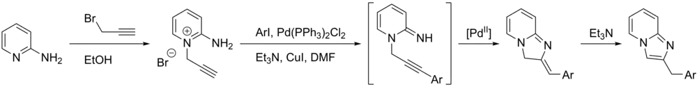 - Bakherad, M.; Nasr-Isfahani, H.; Keivanloo, A.; Doostmohammadi, N. (2008), "Pd–Cu catalyzed heterocyclization during Sonogashira coupling: synthesis of 2-benzylimidazo[1,2-a]pyridine", J. Organomet. Chem., 49 (23): 3819–3822, doi:10.1016/j.tetlet.2008.03.141