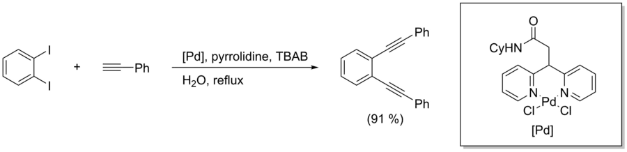 More recently, the dipyridylpalladium complex has been obtained and has been used in the copper-free Sonogashira coupling reaction of aryl iodides and bromides in N-methylpyrrolidinone (NMP) using tetra-n-butylammonium acetate (TBAA) as base at room temperature. This complex has also been used for the coupling of aryl iodides and bromides in refluxing water as solvent and in the presence of air, using pyrrolidine as base and TBAB as additive,[40] although its efficiency was higher in N-methylpyrrolidinone (NMP) as solvent.