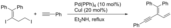 - The preparation of alk-2-ynylbuta-1,3-dienes from the cross-coupling of a diiodide and phenylacetylene, as shown below.[53]