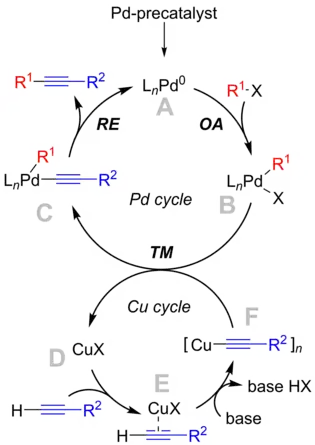 The reaction mechanism is not clearly understood, but the textbook mechanism revolves around a palladium cycle which is in agreement with the "classical" cross-coupling mechanism, and a copper cycle, which is less well known.[9]