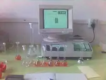 An optical spectrometer (spectrophotometer, spectrograph or spectroscope) is an instrument used to measure properties of light over a specific portion of the electromagnetic spectrum, typically used in spectroscopic analysis to identify materials.[1] The variable measured is most often the irradiance of the light but could also, for instance, be the polarization state. The independent variable is usually the wavelength of the light or a closely derived physical quantity, such as the corresponding wavenumber or the photon energy, in units of measurement such as centimeters, reciprocal centimeters, or electron volts, respectively.