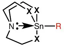 A stannatrane (IUPAC: 1-aza-5-stannabicyclo[3.3.3]undecane) is a tin-based atrane belonging to the larger class of organostannanes. Though the term stannatrane is often used to refer to the more commonly employed carbastannatrane, azastannatranes have also been synthesized (prefix refers to the identity of the atom bound directly to tin center).[1] Stannatrane reagents offer highly selective methods for the incorporation of "R" substituents in complex molecules for late-stage diversification. These reagents differ from their tetraalkyl organostannane analogues in that there is no participation of dummy ligands in the transmetalation step, offering selective alkyl transfer in Stille Coupling reactions.[2][3][4] These transmetalating agents are known to be air- and moisture-stable, as well as generally less toxic than their tetraalkyl counterparts.
