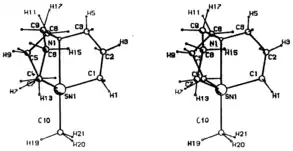 - Jurkschat, K.; Tszchach, A.; Meunier-Piret, J. (1986). "Crystal and molecular structure of 1-AZA-5-STANNA-5-methyltricyclo[3.3.3.01,5]undecane. Evidence for a transannular donor−acceptor interaction in a tetraorganotin compound". Journal of Organometallic Chemistry. 315: 45–49. doi:10.1016/0022-328X(86)80409-0.
